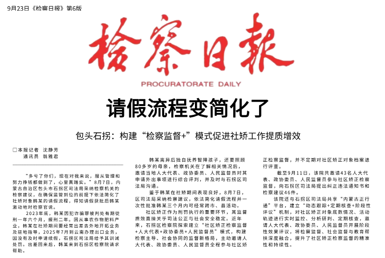 “多亏了你们,现在对我来说,服从管理和努力挣钱都做到了,心里真踏实。”8月7日,内蒙古自治区包头市石拐区司法局采纳检察机关的检察建议,在确保监管到位的前提下依法简化了社矫对象韩某的请假流程,得知请假获批后韩某激动地对检察官说。