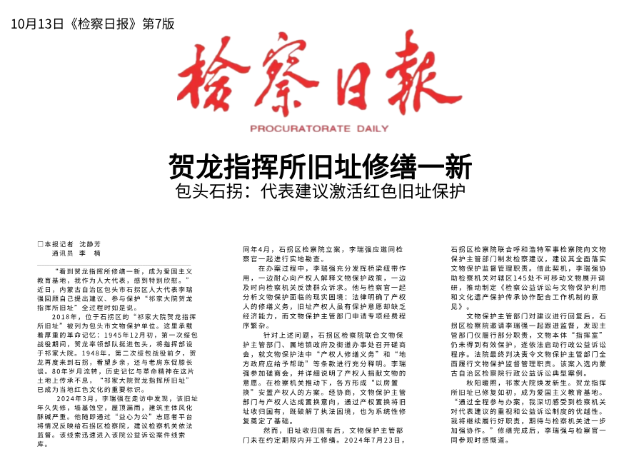 然而,旧址收归国有后,文物保护主管部门未在约定期限内开工修缮。2024年7月23日,石拐区检察院联合呼和浩特军事检察院向文物保护主管部门制发检察建议,建议其全面落实文物保护监督管理职责。借此契机,李瑞强协助检察机关对辖区145处不可移动文物展开调研,推动制定《检察公益诉讼与文物保护利用和文化遗产保护传承协作配合工作机制的意见》。