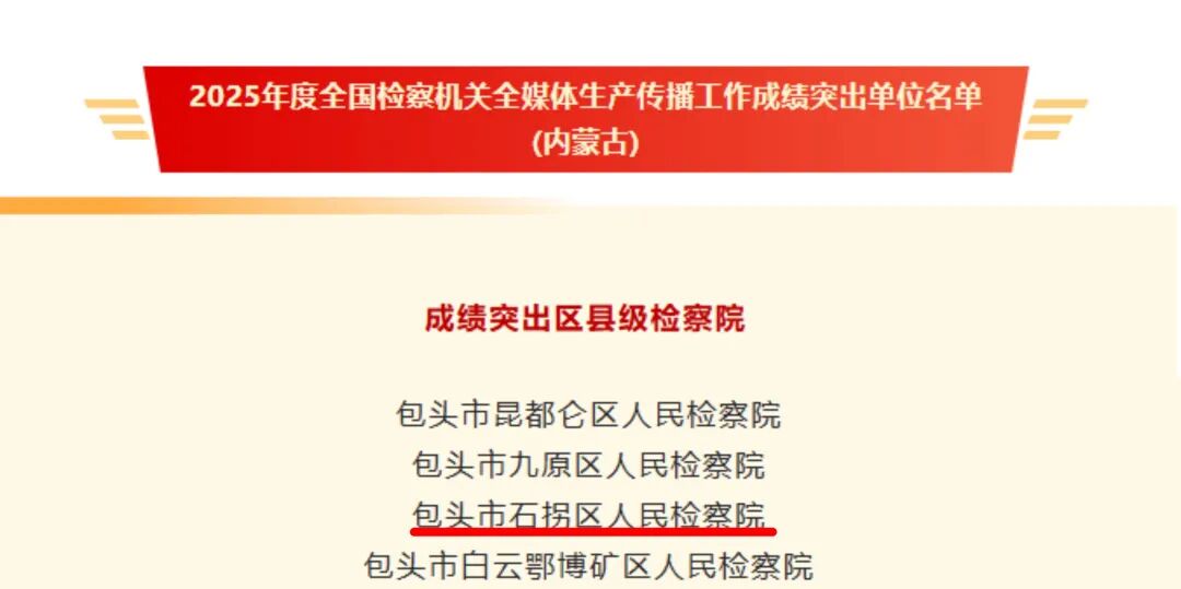 近日,最高人民检察院政治部、检察日报社印发通报,对2025年度在检察全媒体生产传播工作中成绩突出、表现优秀的检察院予以表扬。其中,石拐区人民检察院获评“全国检察机关全媒体生产传播工作成绩突出单位”。