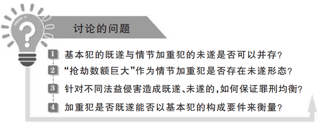 “抢劫数额巨大”作为情节加重犯,也存在未遂形态。对于刑法第263条规定的“抢劫数额巨大”,是指行为人实际抢得的财物数额巨大,还是也包括行为人以数额巨大的财物为抢劫目标但最终没有得手的情形,也即对“抢劫数额巨大”这一情节加重犯是否存在未遂形态,实践认识存在渐进的过程。