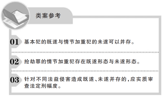 基本犯的既遂与情节加重犯的未遂可以并存,并非绝对排斥。加重犯是与基本犯对应的一种犯罪形态,是指在基本犯基础上,出现刑法分则所规定的特殊的、明确的、单一的加重情形,从而对行为人加重刑罚处罚。刑法在总则部分没有明确规定加重犯的条文,而是在分则中以列举方式予以明确。如刑法第263条规定了抢劫罪,同时又规定了八种加重情节。通说认为,除“抢劫致人重伤、死亡”属结果加重外,其余七种情形均属情节加重。情节加重,是指在基本犯罪构成要件行为之外,还存在严重情节,刑法对其加重法定刑处罚的情形。根据刑法通说,对犯罪既遂、未遂形态的认定应遵循“构成要件齐备说”,以行为人基于故意所实施犯罪行为是否符合刑法分则所规定罪名构成的全部要件为标准来判断。就抢劫罪(基本犯)而言,判断是否既遂亦应如此。抢劫罪侵犯的是复杂客体,包括财产权与人身权,只要侵害其中一种法益,即应认为构成抢劫罪既遂。