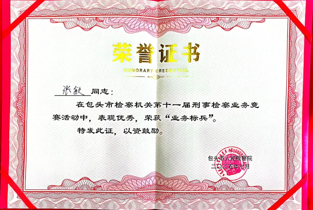 这份荣誉既是对张敏同志个人能力的充分肯定,也是我院长期重视人才培养、狠抓队伍专业化建设的成果体现。我院将以此次竞赛为契机,持续深耕主责主业,不断提升履职能力,锐意进取,追求卓越,努力在新时代检察工作中再创佳绩、再立新功!