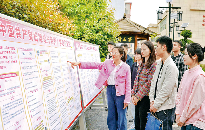 在全党开展党纪学习教育,是加强党的纪律建设、推动全面从严治党向纵深发展的重要举措。连日来,各地区各部门各单位精心谋划部署、抓住学习重点,推动党纪学习教育走深走实。图为2024年4月10日,江西省芦溪县纪委监委干部在《中国共产党纪律处分条例》学习宣传栏前交流。