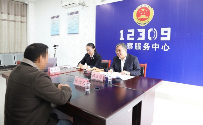 广西壮族自治区检察院党组书记、检察长杨正根(右)到基层检察院接待信访群众。