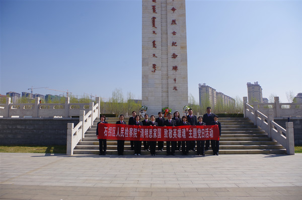 在纪念碑前,由党组成员、副检察长张玉兰,党组成员、检委会专职委员、第一检察部主任吕勇为烈士敬献花篮,整理挽联。全体干警鞠躬默哀,并面向党旗,重温入党誓词。